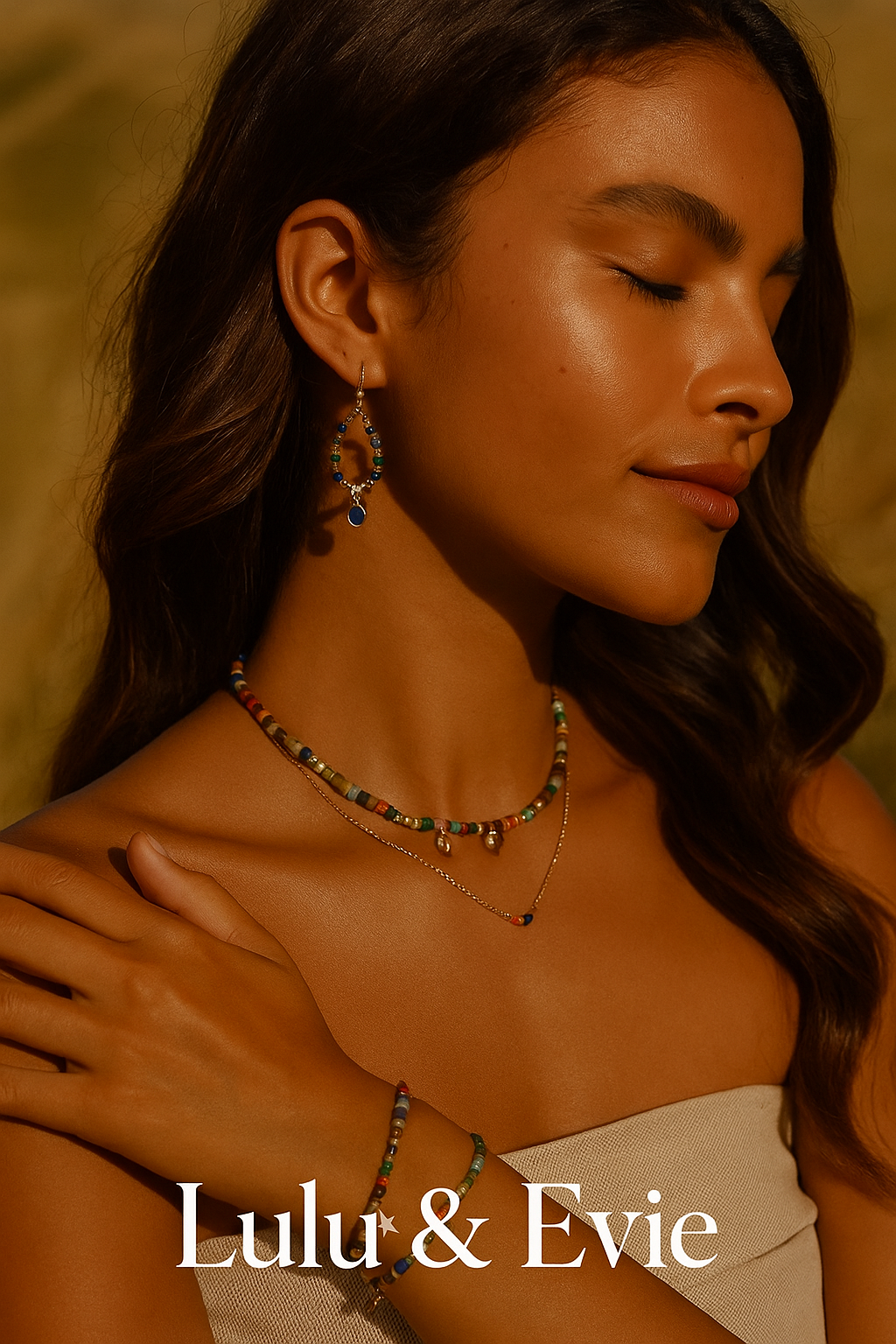 A celebration of color and individuality β this handcrafted necklace and bracelet set brings together natural gemstones in a symphony of vibrant hues. The warm vintage gold tone enhances every shade, making it perfect for layering or wearing solo to brighten any look.