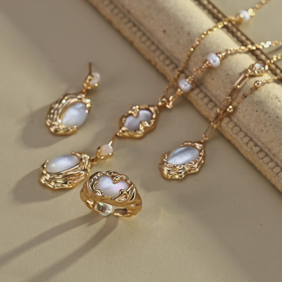 Inspired by the organic beauty of cooling lava, this collection features naturally formed, irregular textures wrapping around soft, lustrous mother-of-pearl. Each piece feels sculptural and unique — vintage in spirit yet effortless to style for every day.
