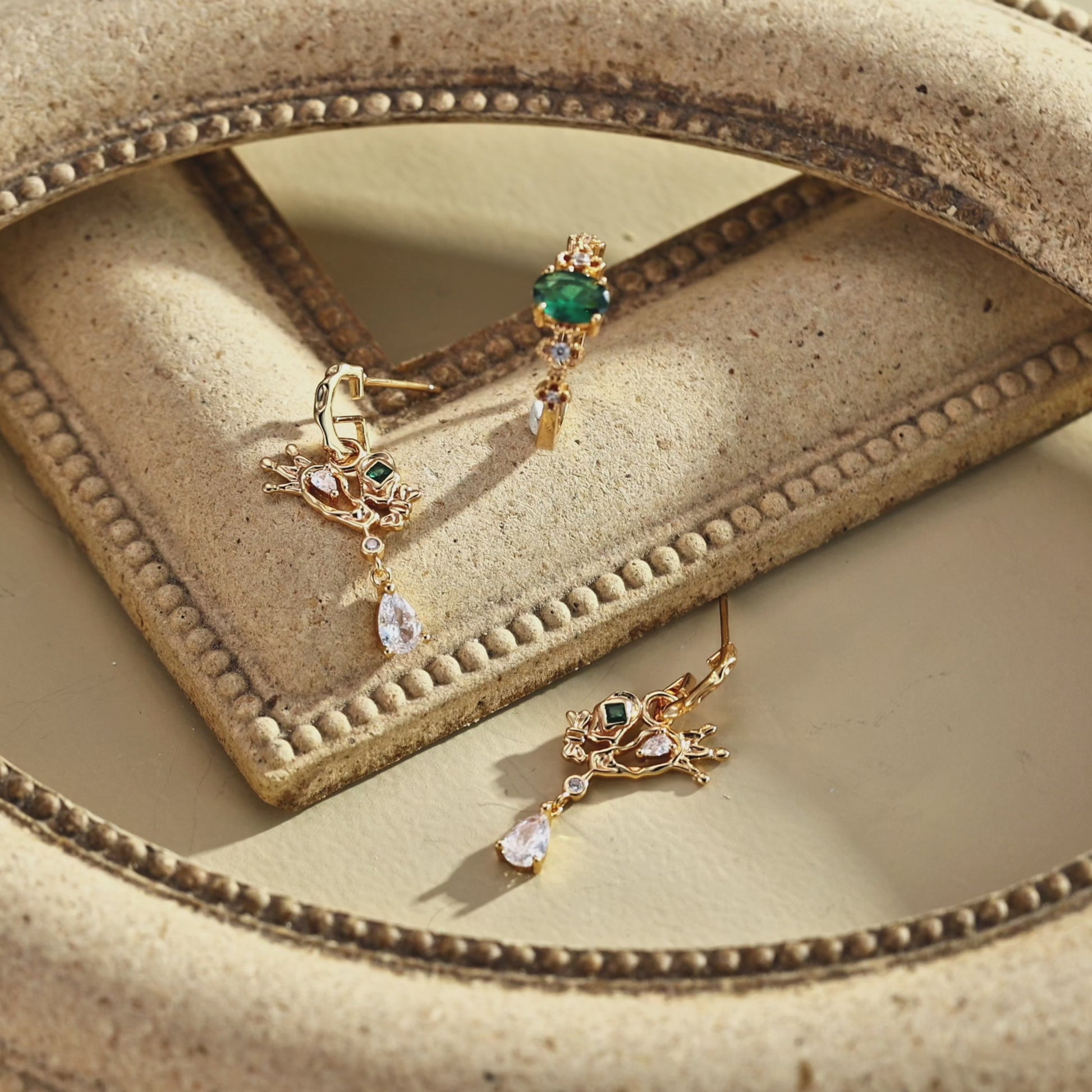 A graceful row of beaded clover motifs—graduating from small to bold—encircles a vivid emerald-green cubic zirconia, creating a silhouette inspired by classic European court jewelry. Its refined texture and intricate detailing give this piece an unmistakably luxurious presence.