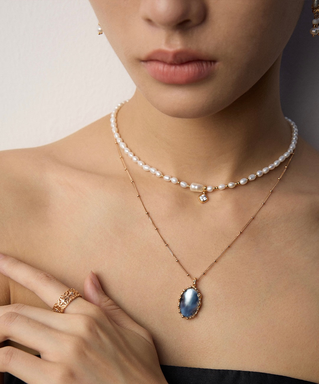 Set in high-quality S925 silver with a warm vintage gold finish, the fluid metal frame gently wraps around the pearl, enhancing its ethereal glow.