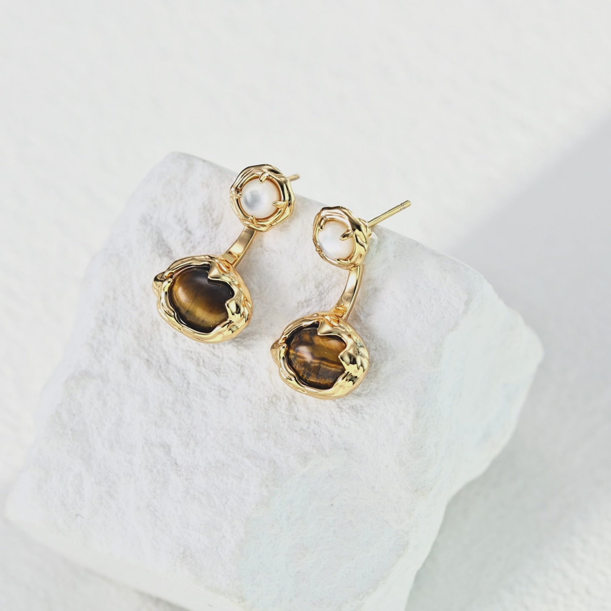 Crafted in S925 sterling silver with a soft vintage gold finish, this versatile design allows you to wear it two ways — as minimalist studs or with the dangling tiger’s eye charm for a statement of quiet sophistication.