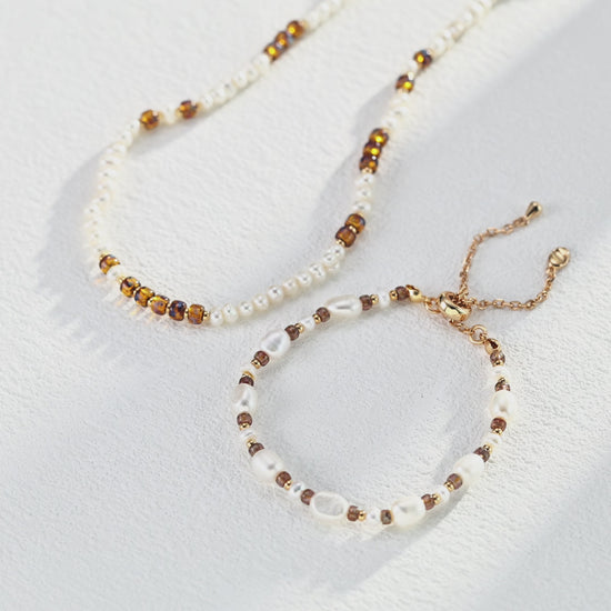 A delicate blend of freshwater pearls and amber-toned glass beads, finished in S925 sterling silver.