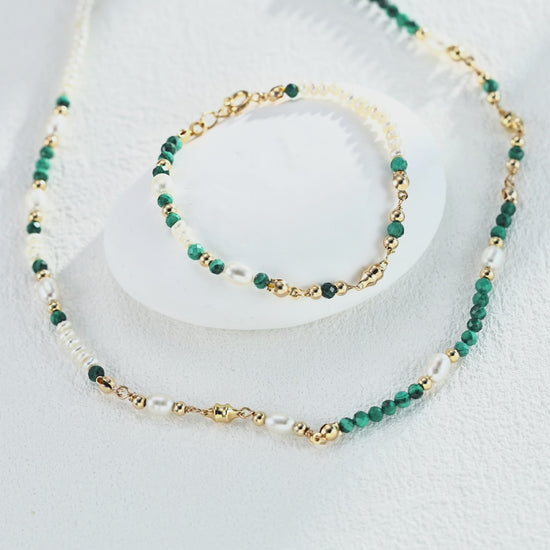 This elegant necklace and bracelet set features a harmonious blend of natural freshwater pearls and faceted malachite beads, accented with vintage gold–plated sterling silver details. The soft luster of pearls contrasts beautifully with the deep green tones of malachite, creating a refined yet effortless look.