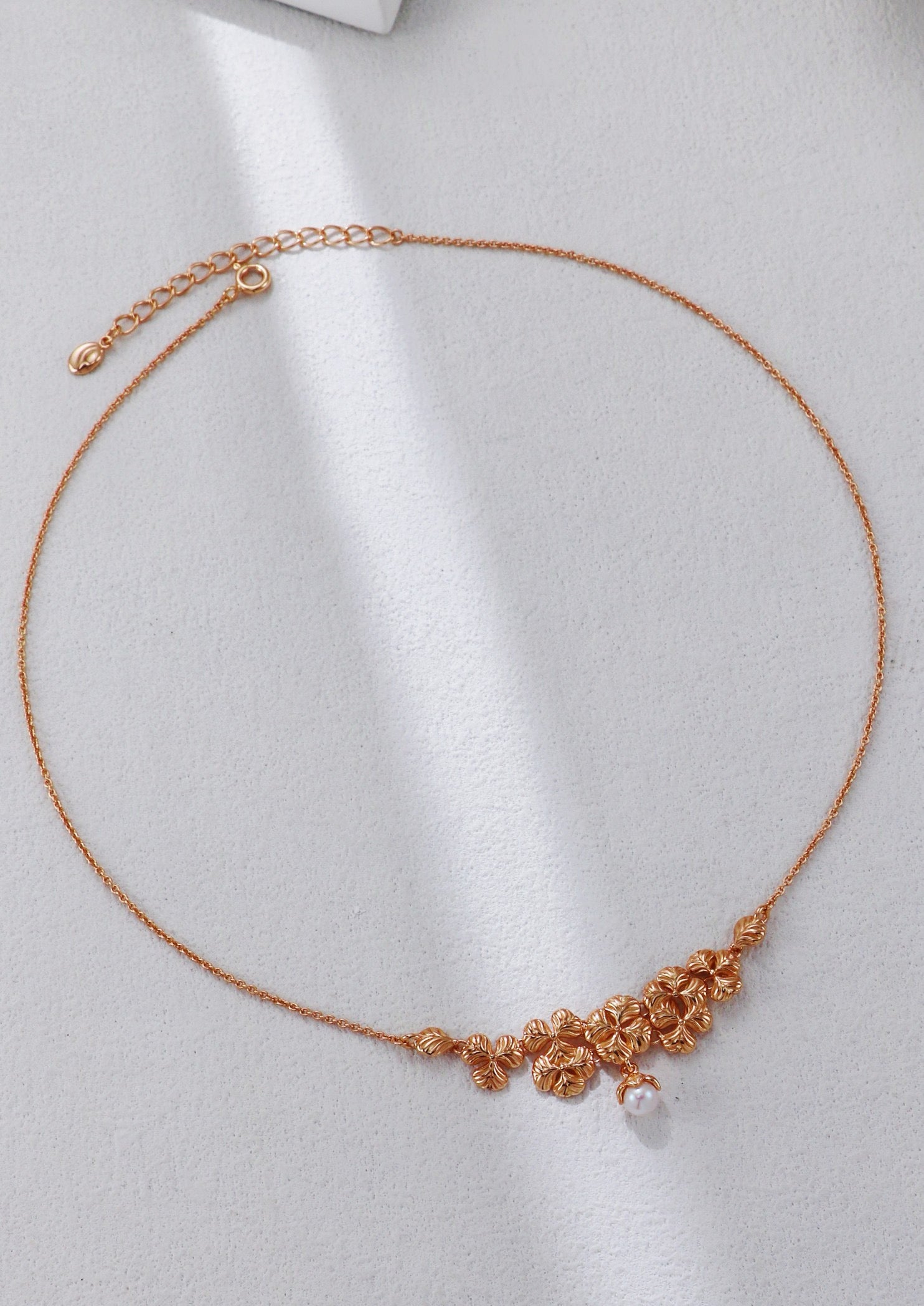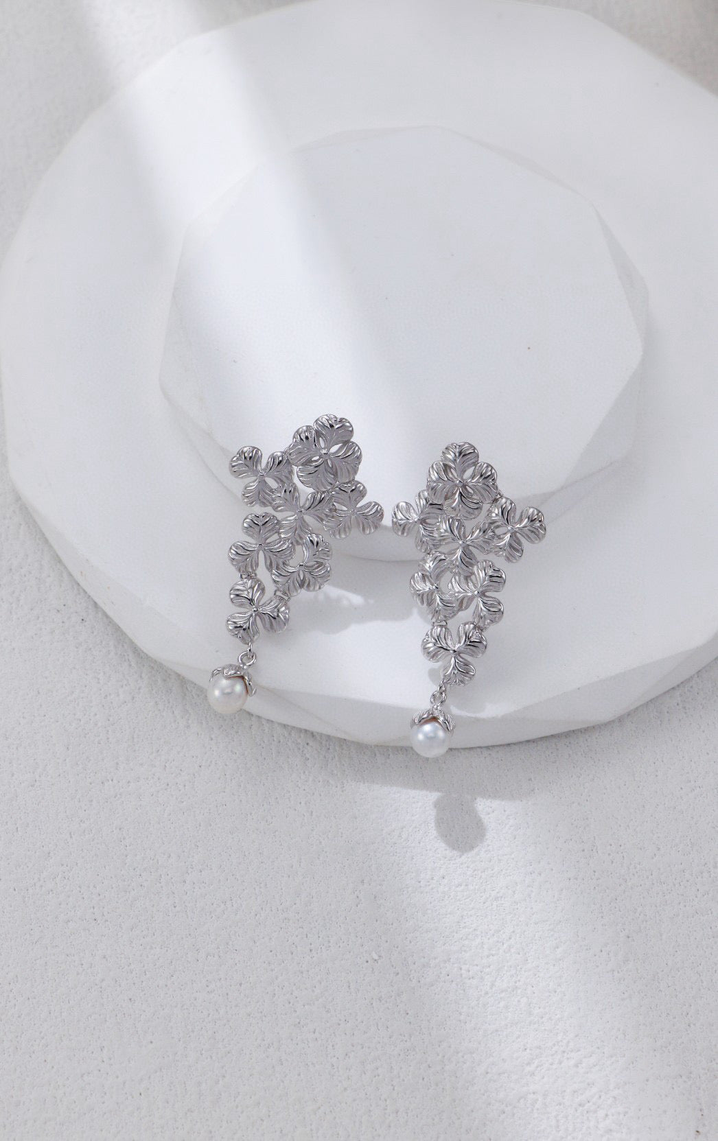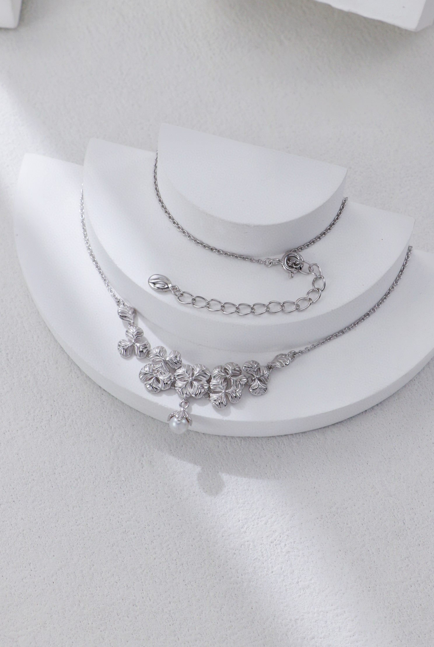 “This elegant jewelry set features a constellation of finely sculpted floral motifs, crafted from S925 sterling silver in vintage gold or classic silver finishes. A single pearl drop hangs delicately from the center, evoking the soft glow of a star in the galaxy. Both the necklace and earrings shimmer with movement, capturing a sense of celestial grace. Wear together or separately for a refined, radiant look perfect for weddings, soirées, or everyday elegance.”
