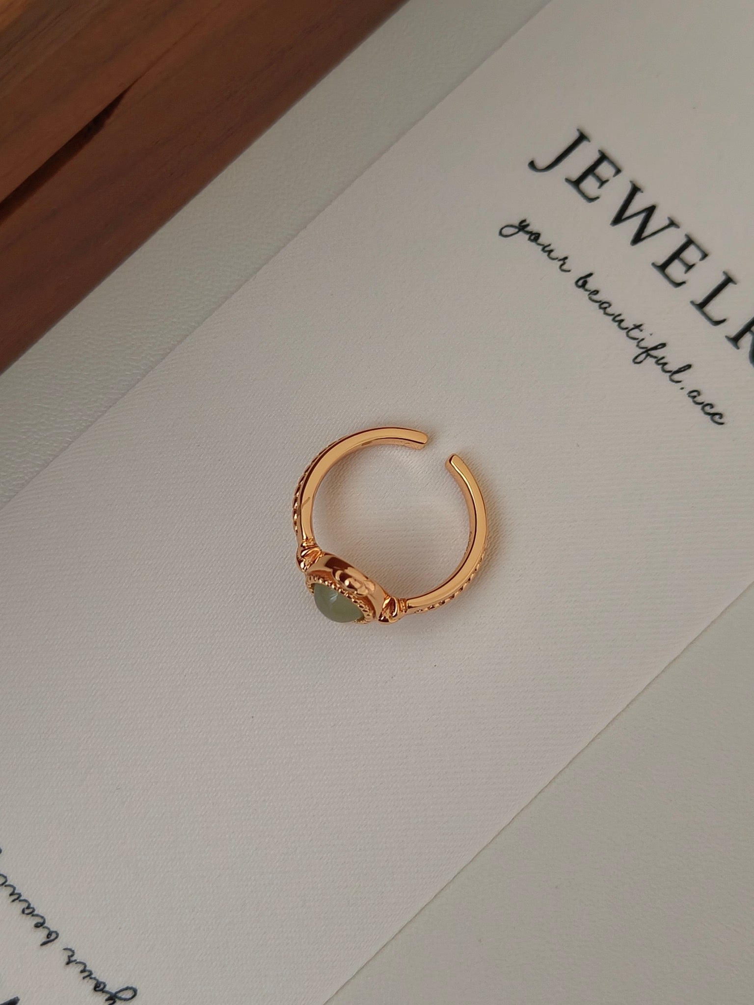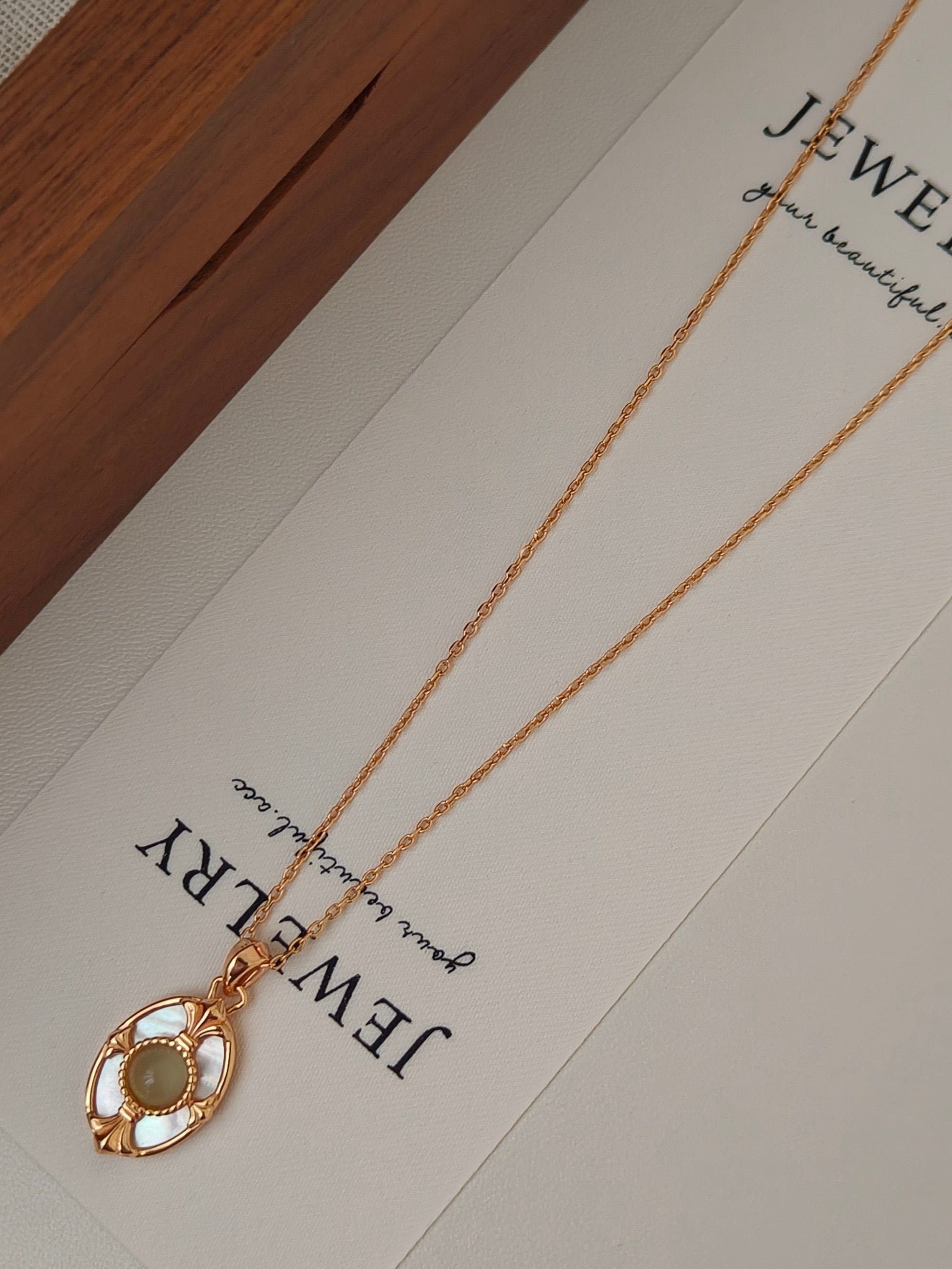 Inspired by vintage elegance, this collection features natural grape jade framed with luminous mother-of-pearl. Delicate gold detailing enhances the smooth oval silhouette, bringing a soft, refined glow to your everyday style.