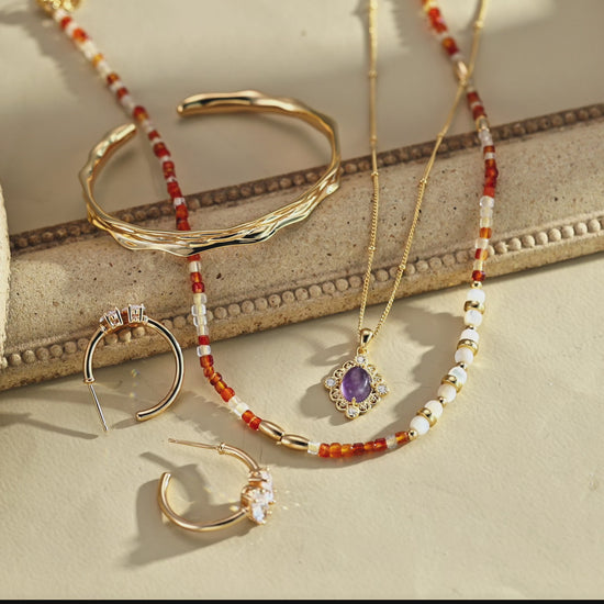 A warm blend of elegance and earth tones — this handcrafted necklace and bracelet set features natural red agate, mother-of-pearl, and 925 sterling silver accents. The combination of deep amber hues and pearly shimmer brings a gentle vintage charm that complements any style.